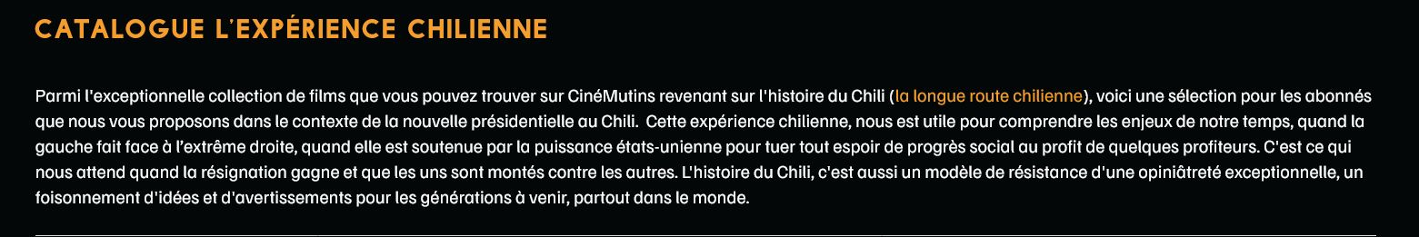 Texte de présentation du Catalogue « L’Expérience chilienne » extrait du site internet CinéMutins.com : « Pour la première fois au Chili, un admirateur revendiqué de Pinochet entre à La Moneda par les urnes. Ce dimanche 14 décembre 2025, José Antonio Kast a remporté la présidentielle avec 58,2 % des voix (vote obligatoire), face à la candidate de gauche Jeannette Jara (41,8 %). Kast est le fils d’un Allemand installé au Chili après-guerre, enregistré comme membre du parti nazi. En 2017, il déclarait à propos de Pinochet : « S’il était vivant, il voterait pour moi ».