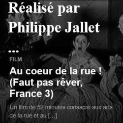Zoom sur le théâtre de rue en 2003. Dans la rue, l’humour, le rêve et la liberté s’expriment. Tous les espaces libres sont investis, tous les genres sont permis, l’extravagant côtoie le militant, le burlesque se mêle à l’engagé. Philippe Jallet réalise un film de 52 ‘ consacré aux arts de la rue et au travail des comédiens de rue. Il est notamment diffusé dans l’émission de France 3 « Faut pas rêver »... Continuer la lecture de « Le théâtre de rue en 2003, un documentaire signé Philippe Lallet … »