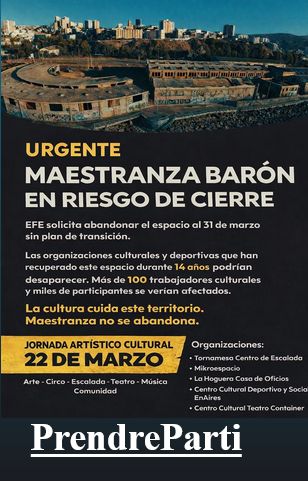 A Valparaiso, les organisations culturelles et sportives qui occupent depuis 14 ans la Maestranza Barón sont en état d’alerte suite aux informations émises par EFE, Compagnie des Chemins de Fer de l’État, qui leur demande de quitter l’enceinte à la fin de ce mois de mars.