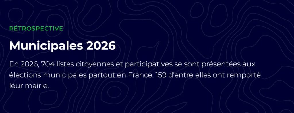 Ces victoires ne sont plus des exceptions, mais le signe d’une transformation de fond qui s’incarne à travers une nouveau paysage municipal de villages et des villes participatives à découvrir parmi lesquelles : Vaour, Le Bourget-du-Lac, Plessé, La Montagne, Saint-André-lez-Lille, Crest, Plaisance-du-Touch, Penne, La Roche-sur-Foron, Castanet Tolosan, Notre-Dame-des-Landes, etc.